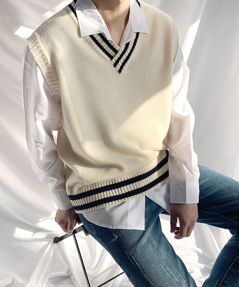 - 니트 베스트 + 데님 팬츠 + 빈티지 스니커즈